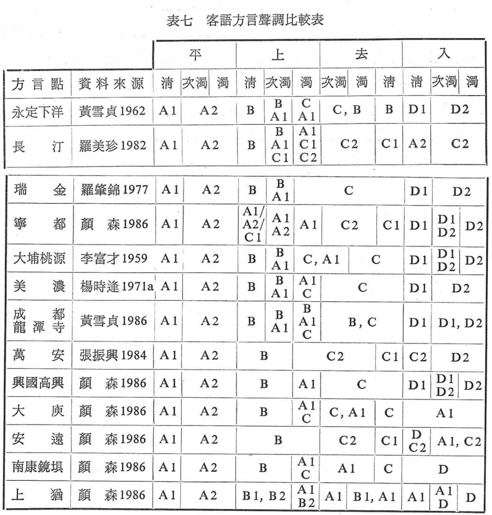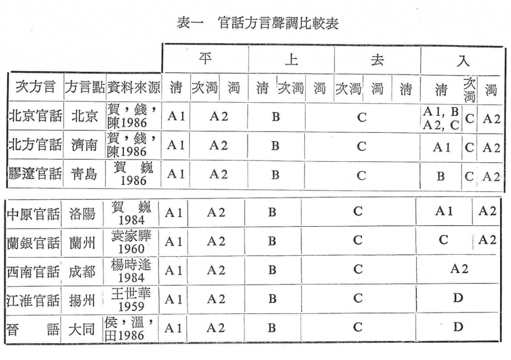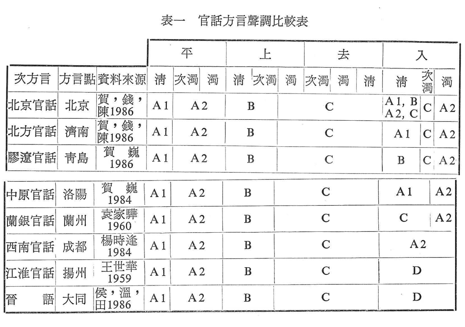 表中的A、B 、C、D表示今調的平、上、去、入,1、2表示陰調和陽調。次方言中的晋語,在構詞上有獨特的地方(侯精一1986),但是它的音韻結構和其它的官話方言並没有很大的差別(丁邦新1982,李榮1985),因此表一暫時放在一起討論。