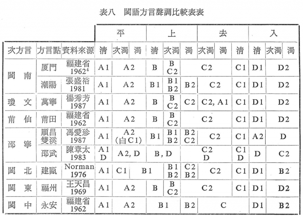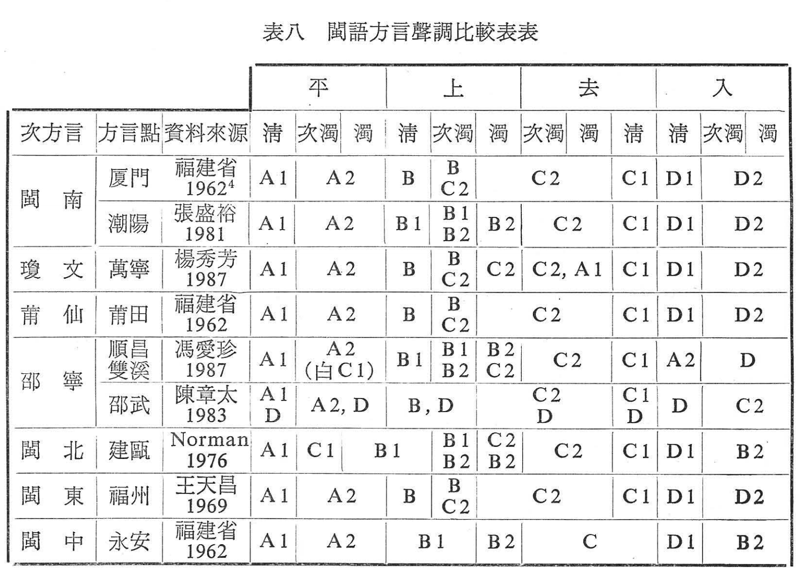 9. 閩語大致可分七個次方言(張振興1985),現在各酌取一兩個方言點列成表八,以供討論。