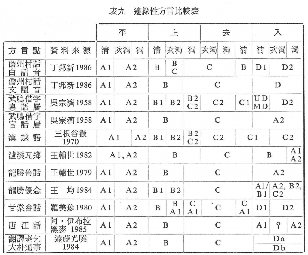 10. 最後,我們再來看一些邊缘性的方言,它們包括一些個别方言,如海南島的儋州村話;混合語或漢語借字系統,如湖南瀘溪瓦鄉話、廣西龍勝伶話、優念話、福建福安的甘棠畲話、甘肅的唐汪話、武鳴壯語、越南的漢越音,以及《翻譯老乞大、朴通事》當中的聲調系統。這些方言的聲調比較,請看表九。