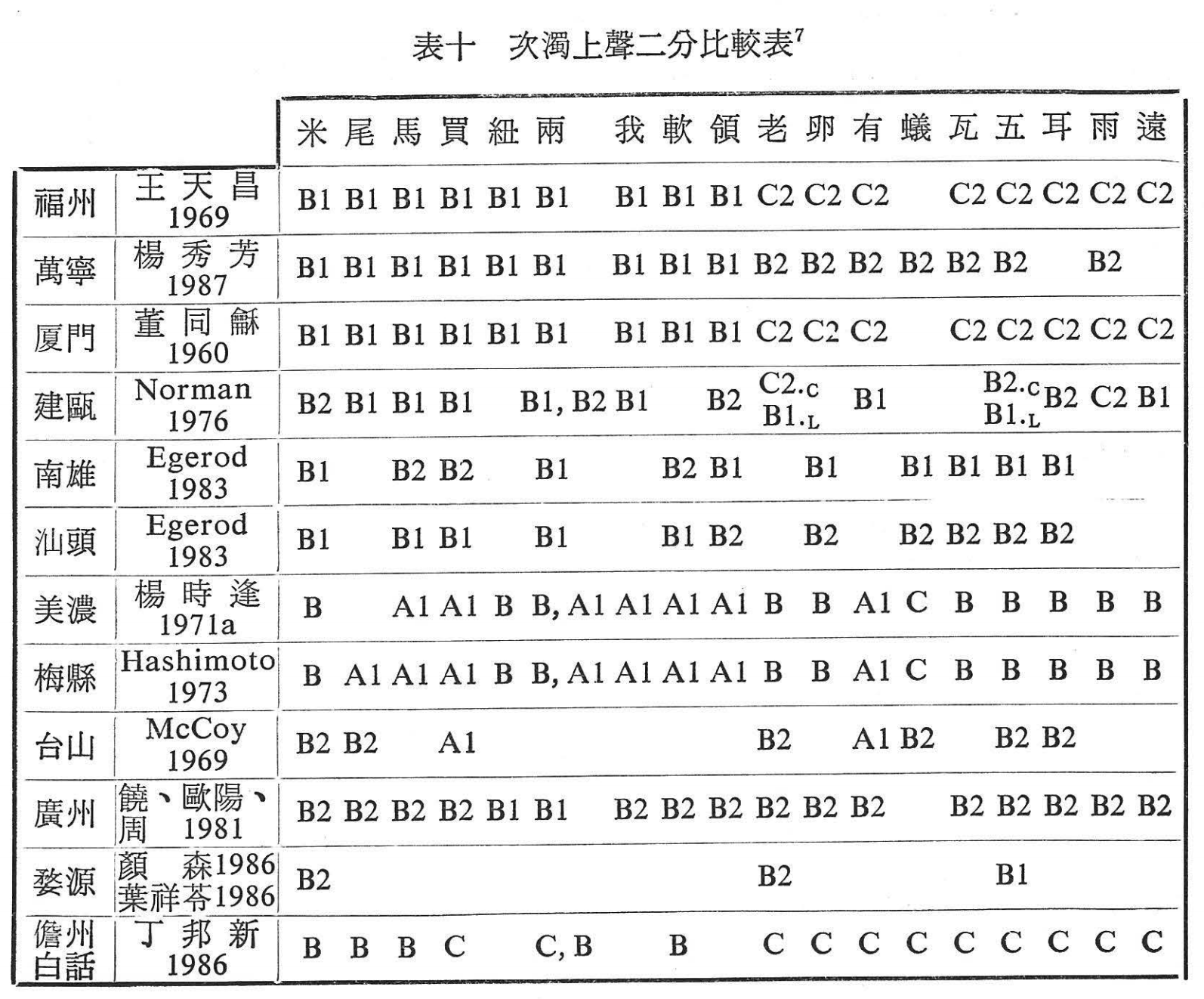 從這一點出發,配合以上所作的觀察,對於現代方言中濁上歸去的演變趨勢,我們可以得到這様的幾點認識。第一,濁上歸去是八世紀以後北方漢語開始有的一種新變化。這種變化的特點是全濁上歸去,次濁上歸陰上。這個變化形成之後,一定很快地成為當時優勢語中重要的成分之一,並因而擴及到整個官話區域,所以今天的官話方言才會表現得如此一致。第二,隨著唐宋以後江南的進一步開發,北方方言的影響不斷南下。官話型的濁上歸去,便在南方方言中造成了不同程度的同化。同化的程度,反映了影響的大小,其中湘語、赣語已經幾乎完全同化;江蘇吴語和浙江吴語的差別,也正在同化的有無和深淺。第三,次濁上與濁上同類的方言,一定曾經廣泛流行於江南。現代吴語、閩語、粤語和若干邊缘性的方言,都保留了這個特點。並且因為這種結構上的差異,在承受官話型濁上歸去這一規律影響時,産生了不同的型態。相形之下,客語的次濁上與陰上同類,則明顯的標識出了北方方言的特點。第四,赣、客語的全濁上歸陰平,和客語的次濁上歸陰平,也使得官話型濁上歸去的同化工作在相當程度上受到干擾,而牽引出新的演變方向。第五,許多方言都有次濁上二分的現象。從前大家多半孤立地看這個現象,以為必然反映了古語聲母上的分别。現在我們知道,這是次濁上視同全濁上的南方型方言和次濁上視同清上的北方型方言,兩種不同的結構互相激盪影響所造成的。也因此它們雖然次濁上聲字都二分,但是歸字卻不完全一様,請参看表十的比較。雖然表十所選的字很有限,我們卻可看出,某方言一致的,另一個方言卻未必。這種参差的現象,原是規律推移時常見的現象。全部推到古語的分别上去,是並不妥當的。