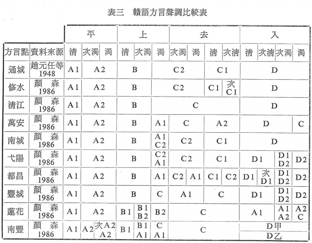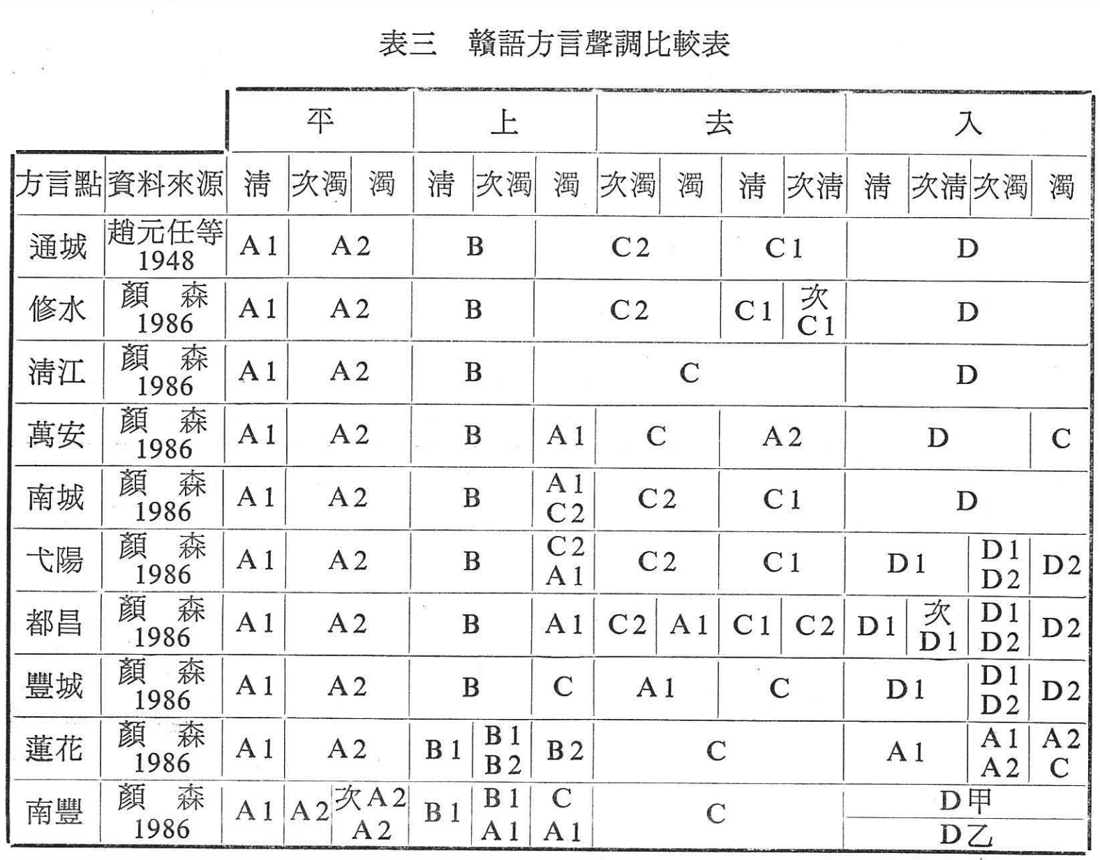 一部分赣方言有「送氣分調」的現象,表三中的修水、都昌、南豐就是這様的方言。南豐入聲字都收-ʔ尾,但分成兩類。甲類讀12,是鹹深山臻等攝的入聲字。乙類讀55,是宕江曾梗通攝的入聲字。這些都是相當特别的現象。
