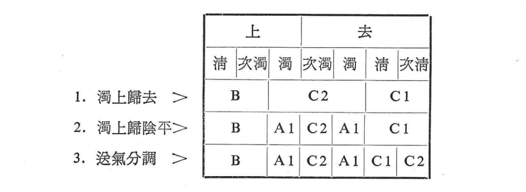表一很清楚的顯示出來官話方言濁上歸去的一致性。從比較研究的觀點,我們可以説濁上歸去在這些次方言的共同祖語時期就已經存在了。再配合上一節對文獻資料的理解,這個祖語和盛唐東都方言的淵源關係,應該是非常清楚的。
