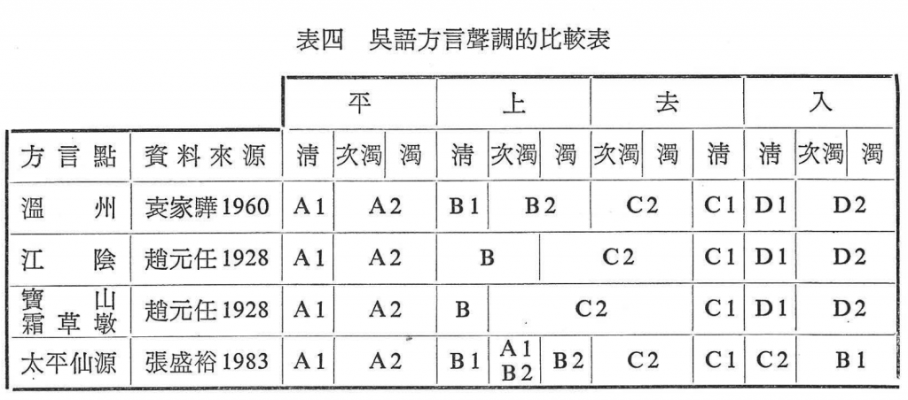 5. 表四是現代吳語中幾個代表方言聲調的比較。