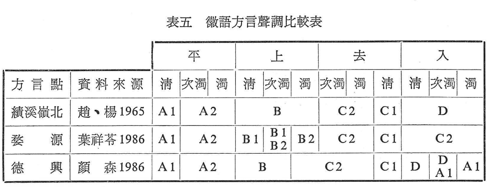 6. 徽州方言是皖南介於吴語和赣語交界處的一些方言,這些方言兼具若干吴語和赣語的色彩,但在濁上歸去這一點上,卻顯示了本身的特點。表五列舉了三個徽語方言,以供觀察。