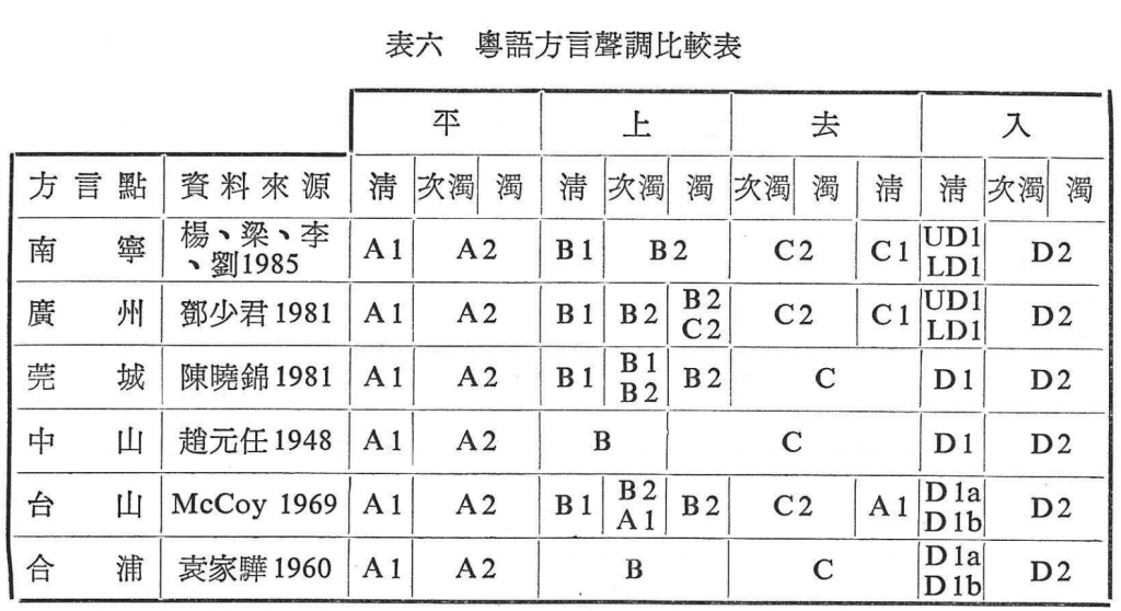 表中南寧、廣州的UD1、LD1是大家熟悉的上陰入、下陰入;臺山、合浦的D1a、D1b也正相當廣州等地的上、下陰入。