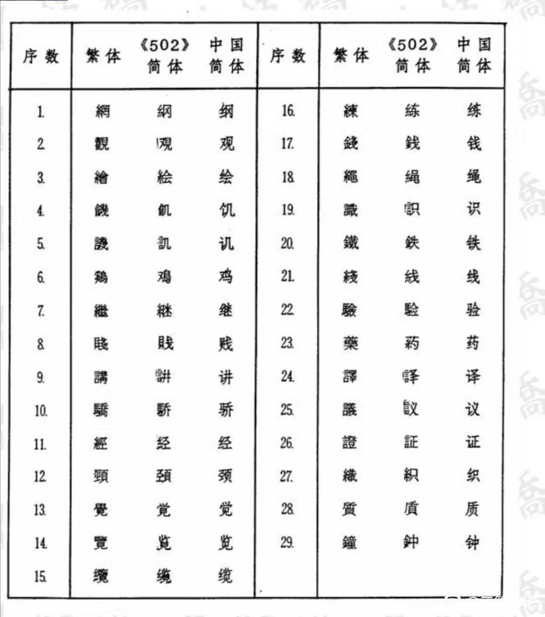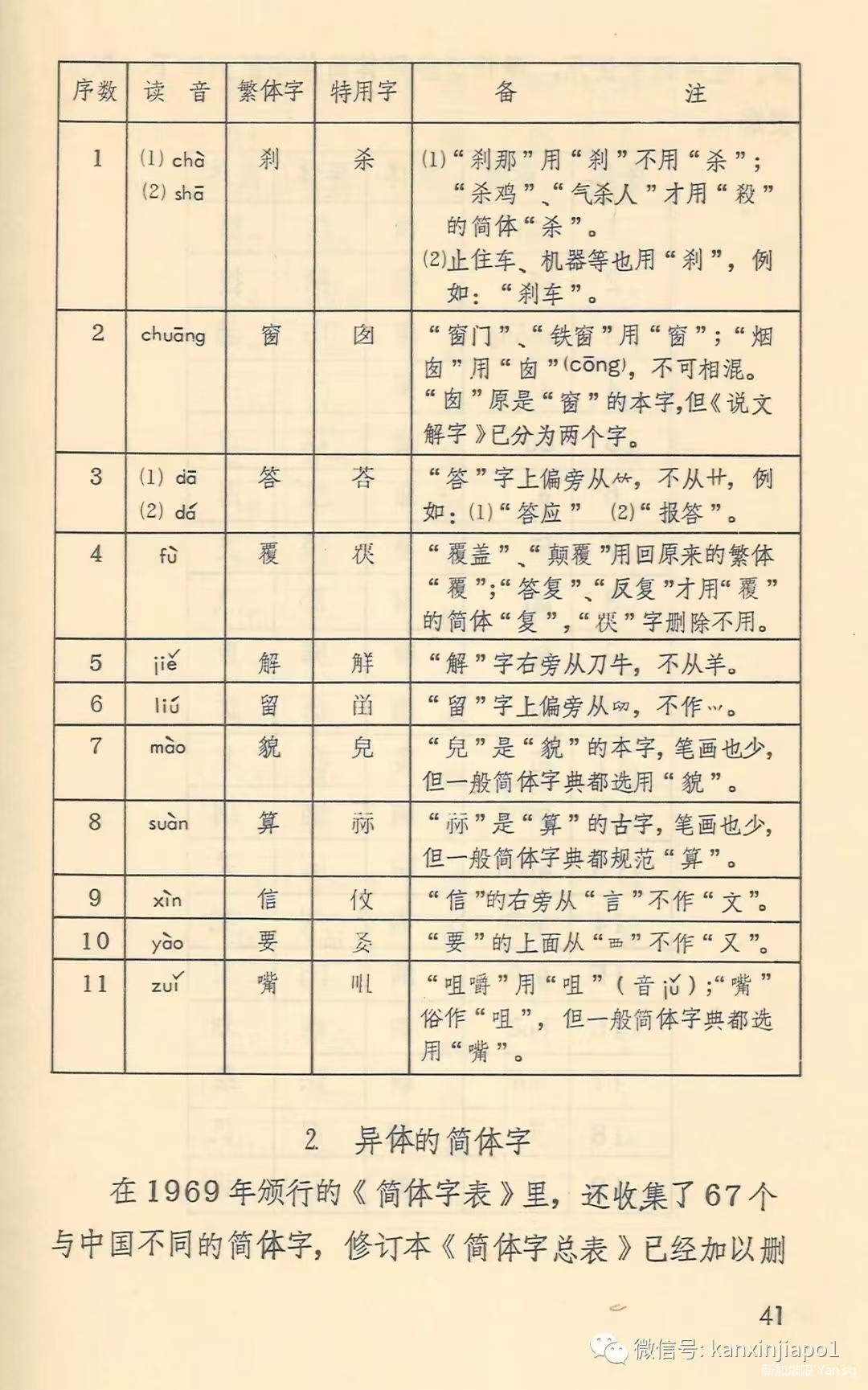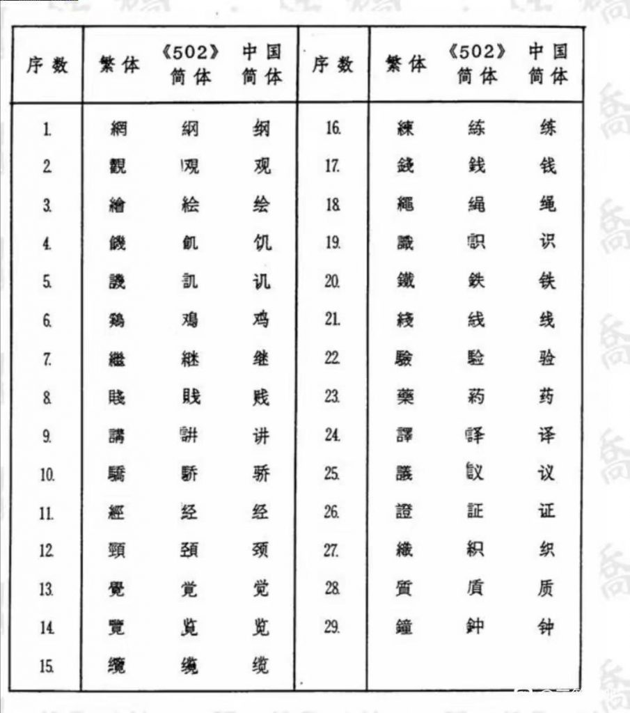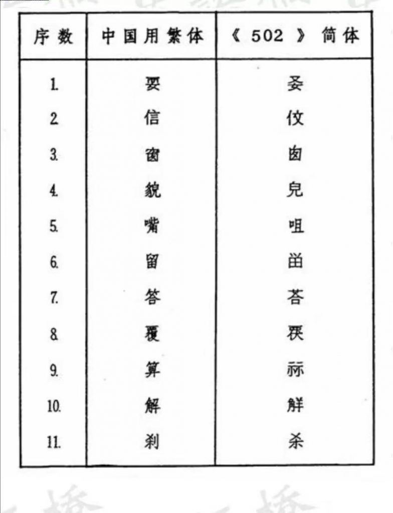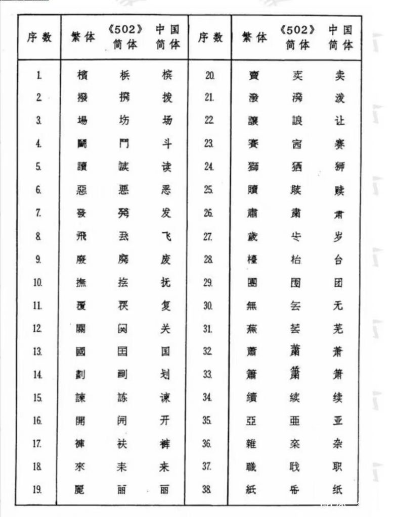 近代以降國勢陵夷,東洋(中日韓越)諸國遂有所謂文字改革之議,中國日本無論矣,蕞爾之邦新加坡亦於1969年推出所謂《簡體字表》,共收簡體字502個,故亦稱《502簡體字表》,其簡體字與中國不同者67個,1976年星國政府廢止該表,完全改從中國《簡化字總表》,惟改稱《簡體字總表》耳。茲將星國1969《簡體字表》簡體字與中國簡化字不同者臚列於下。
