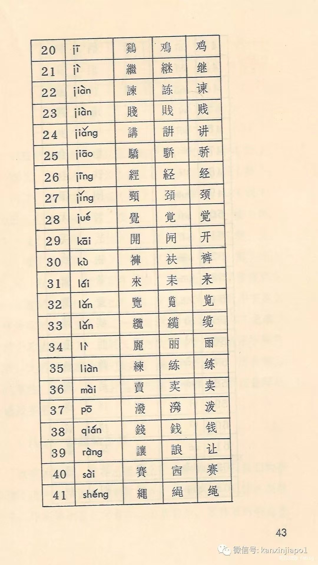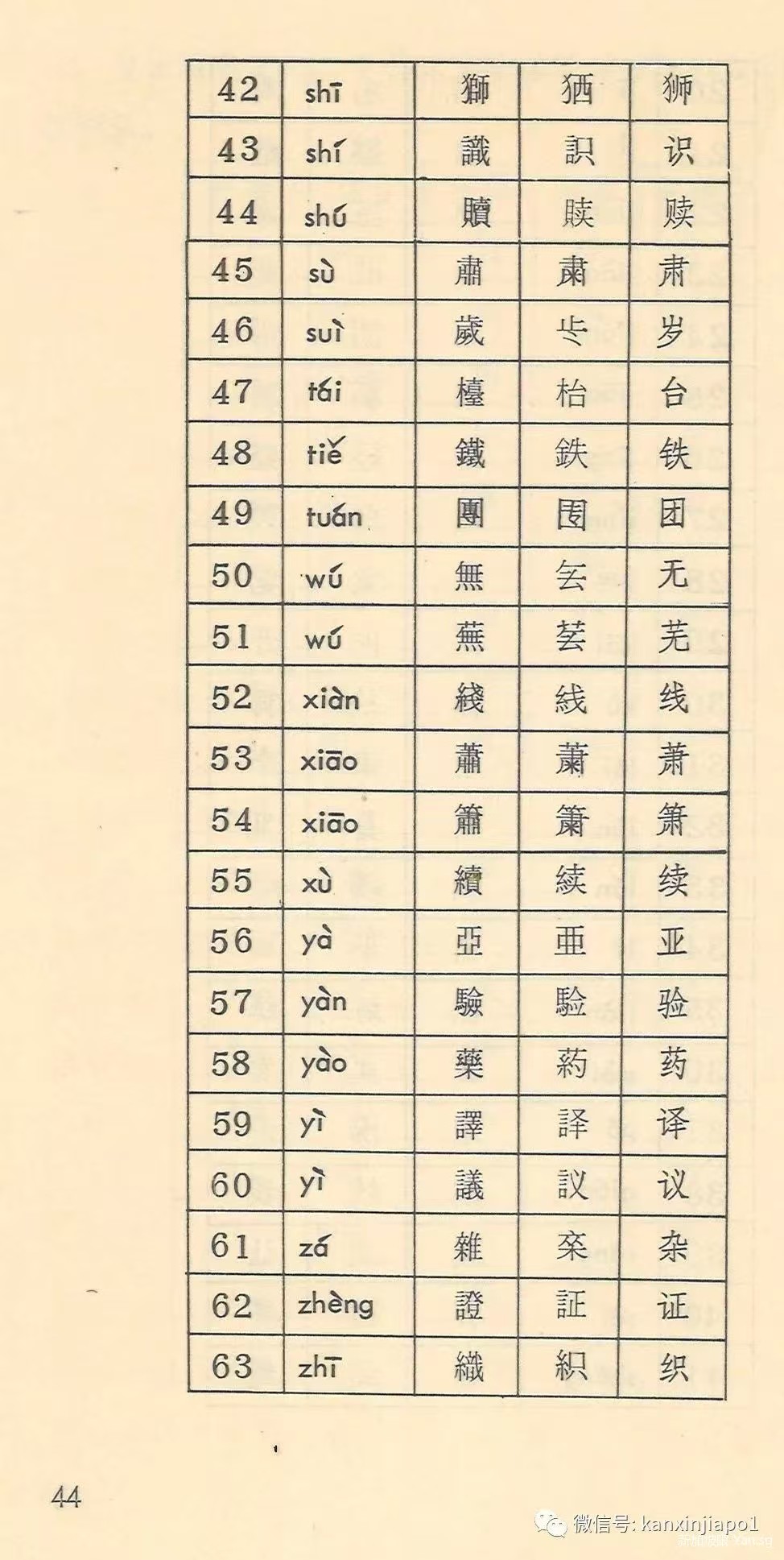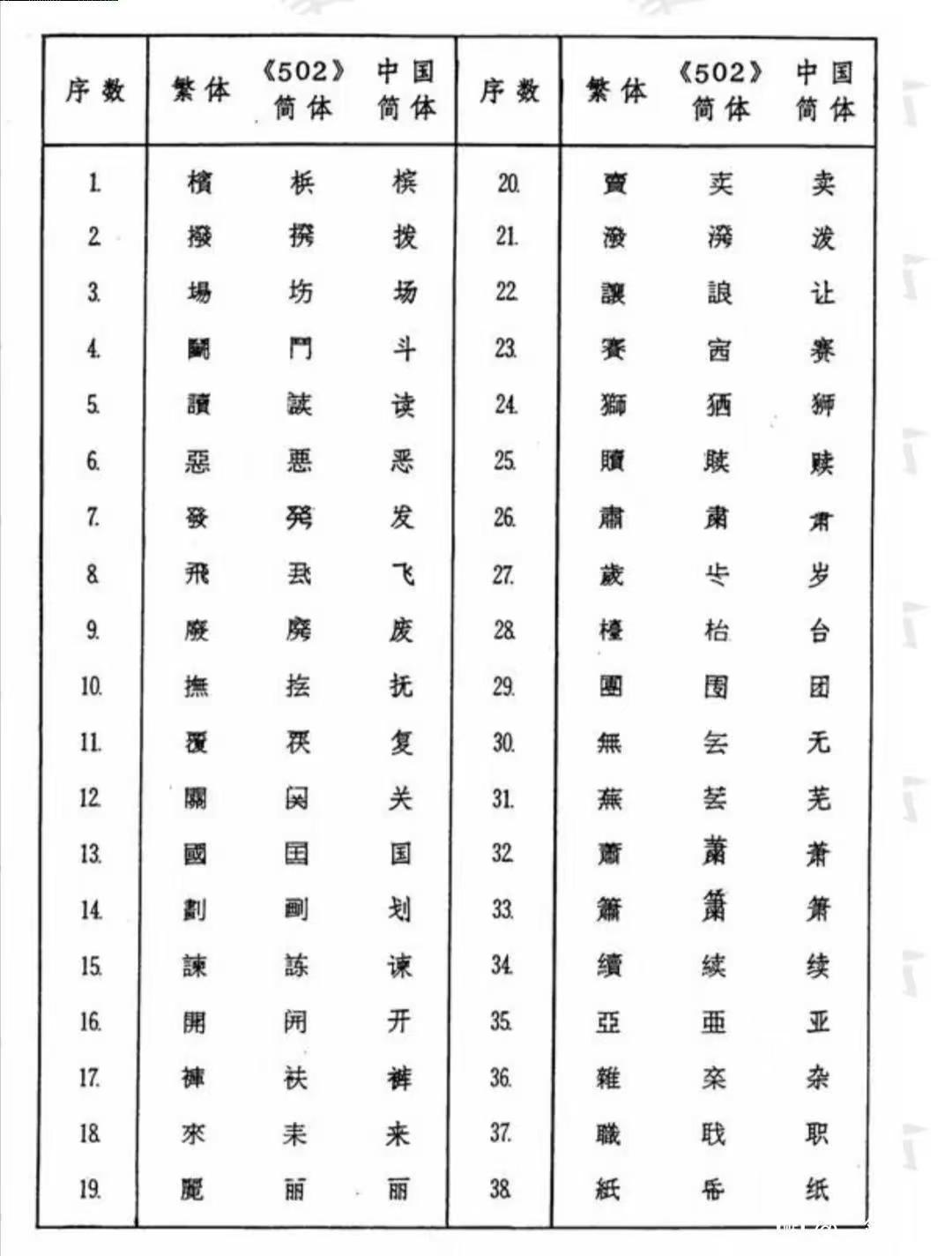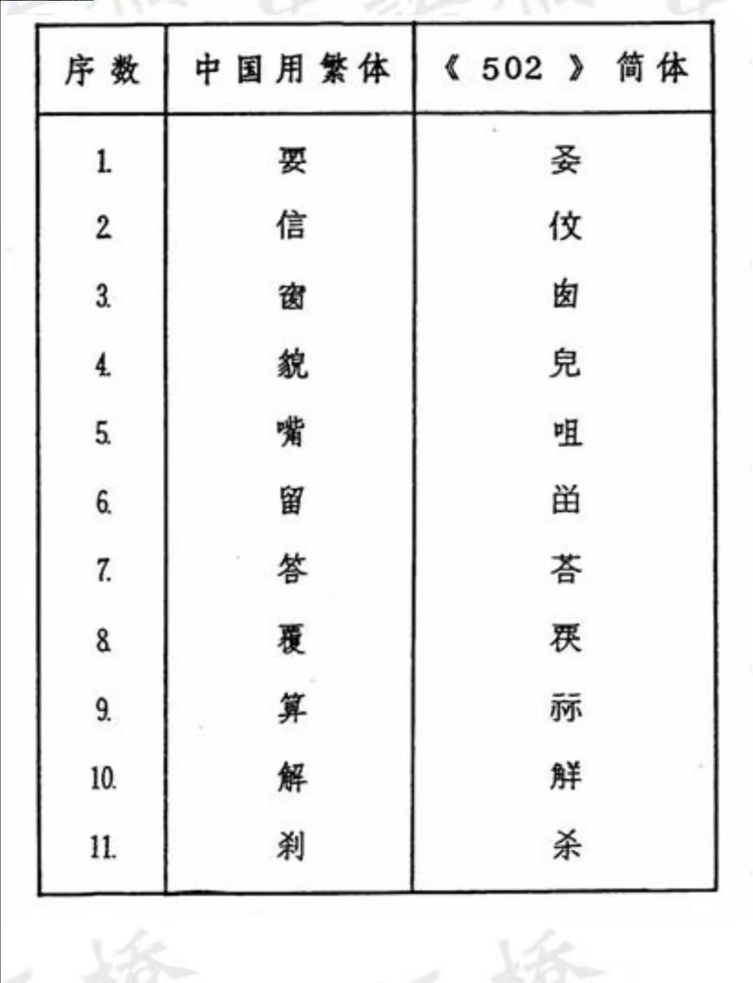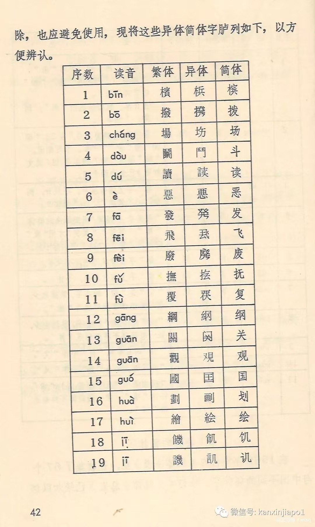 近代以降國勢陵夷,東洋(中日韓越)諸國遂有所謂文字改革之議,中國日本無論矣,蕞爾之邦新加坡亦於1969年推出所謂《簡體字表》,共收簡體字502個,故亦稱《502簡體字表》,其簡體字與中國不同者67個,1976年星國政府廢止該表,完全改從中國《簡化字總表》,惟改稱《簡體字總表》耳。茲將星國1969《簡體字表》簡體字與中國簡化字不同者臚列於下。