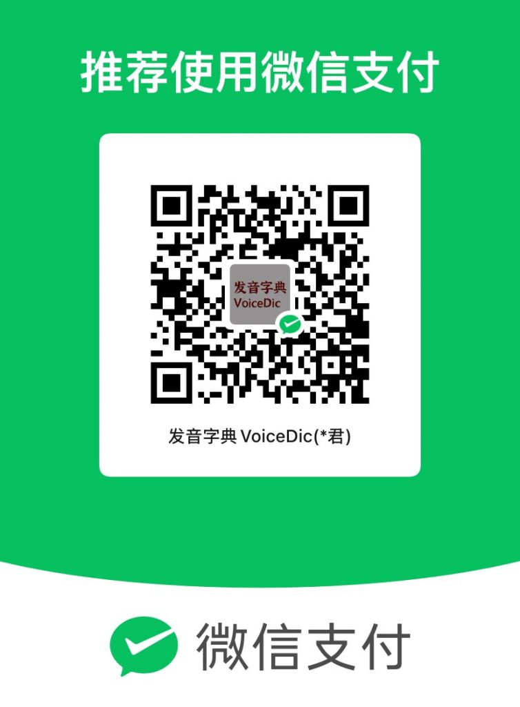 如果您选择捐赠资金,可以通过扫描下方的微信二维码付款,您可以在备注中留下您的信息(以便张榜公布)。无论金额大小,每一份支持对我们来说都是宝贵的。 您的慷慨捐赠将直接用于支付「发音字典VoiceDic」的服务器和宽带费用。