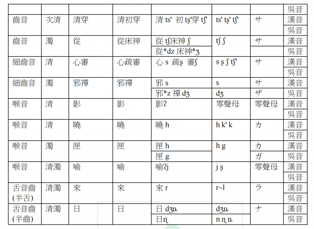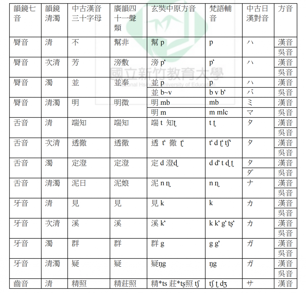 2.濁音多未清化:古音十九紐「脣、舌、牙」三音之濁音,皆保存濁音,與中古日本吳音同,極少數出現濁音清化而相對於濁音者,應屬當代北方漢音音系。「齒」音之濁音,「從、床、神」字例僅二個,呈現濁音清化現象,「邪、禪」混同,多保存濁音。「喉」音之濁音「匣」母,則呈現濁音清化現象,已混同於曉母。